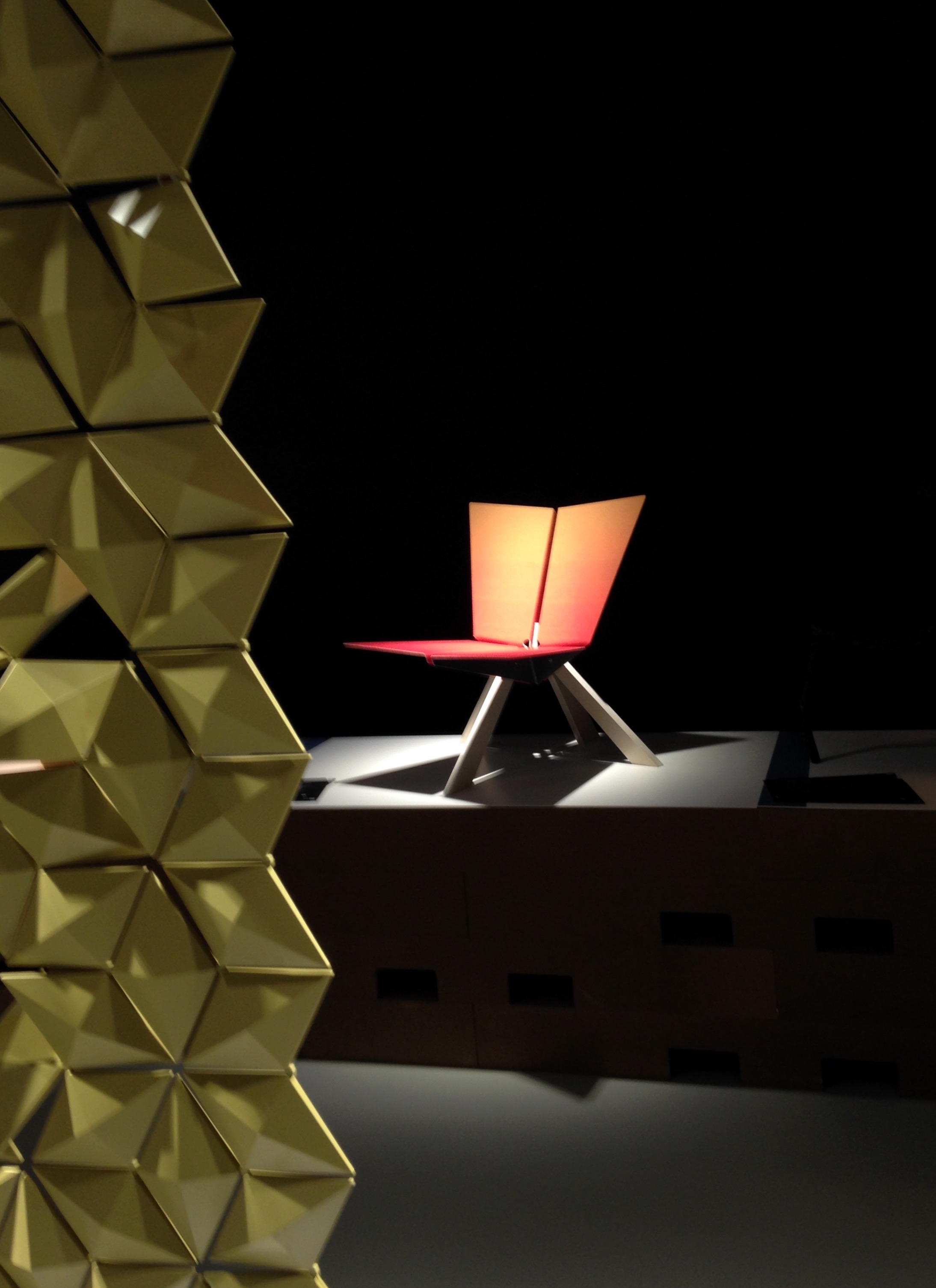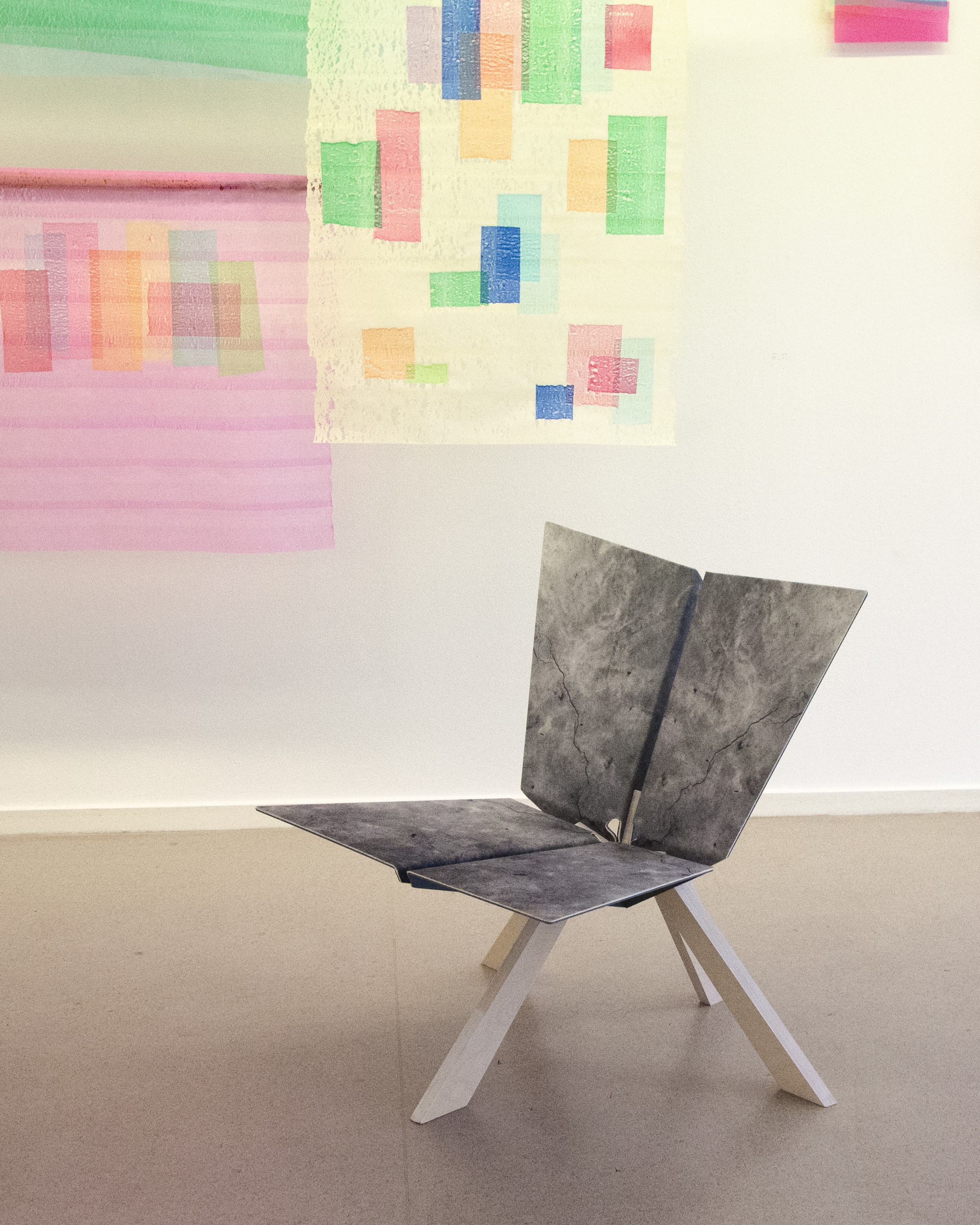 Farfalla Farfalla is inspired by the anatomy of the butterfly. Legs and wings are joined in the center of the chair. The wings are made of steel sheets and covered with a printed rug. Material: wood, steel, printed rug Dimension: 78x78x78cm
